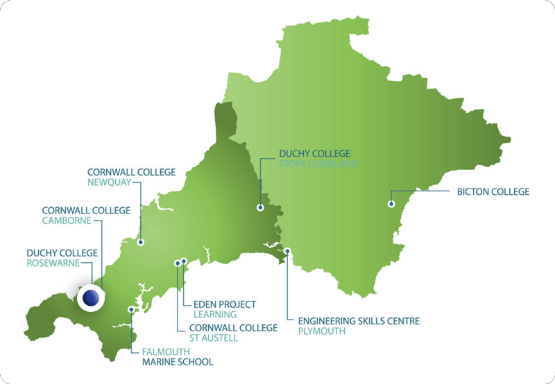 Cornwall College has campuses in Camborne, Newquay and St Austell and also as part of The Cornwall College Group, has specialist land-based and marine partner colleges, Duchy College, Bicton College and Falmouth Marine School across the region. We also have a dedicated Engineering Skills Centre in Plymouth, a Professional Skills Centre at St Mellion Resort and a training partnership with the world famous Eden Project.
